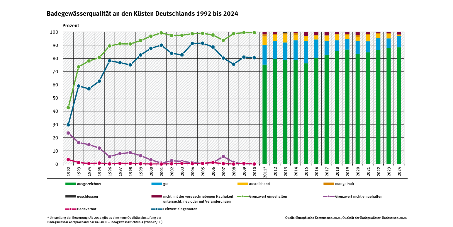 Die Ergebnisse der Qualitätsbewertung zeigen, dass die Qualität der deutschen Badegewässer insgesamt sehr gut ist (siehe Abb. „Badegewässerqualität an den Küsten Deutschlands“ und Abb. „Badegewässerqualität an den Binnengewässern Deutschlands“). Im Jahr 2024 erfüllten rund 98 % der beurteilten Badegewässer die Qualitätsanforderungen der EU. 90,5 % der Badegewässer erreichten sogar eine ausgezeichnete und weitere 6,2 % eine gute Qualität.