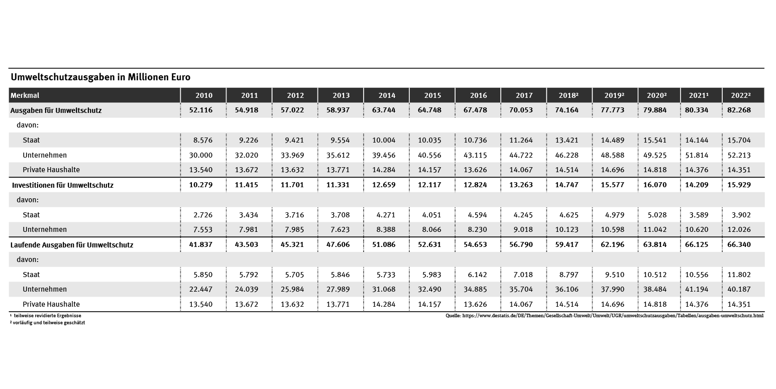 Das Statistische Bundesamt erfasst regelmäßig die Ausgaben von Staat, Unternehmen und privaten Haushalten für den Umweltschutz. Die Daten zeigen die Entwicklung der Ausgaben insgesamt und die Aufteilung auf die verschiedenen Bereiche wie z.B. Abfall, Abwasser, Luftreinhaltung und Klimaschutz.