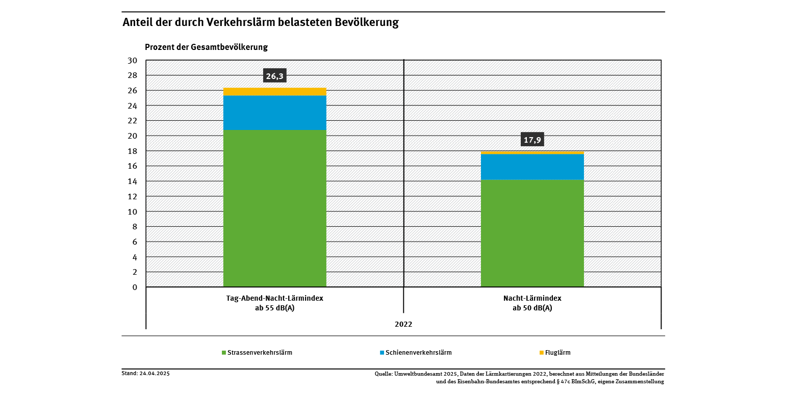 Rund um Hauptverkehrsstrecken und Großflughäfen sowie in Ballungsräumen waren nach der Lärmkartierung 2022 nachts etwa 14,9 Millionen (Mio.) Menschen von Verkehrslärm über 50 Dezibel (dB(A)) betroffen. Ganztägig waren rund 21,9 Mio. Menschen einem Verkehrslärm von mehr als 55 dB(A) ausgesetzt. Damit waren 17,9 % der Bevölkerung durch nächtlichen und 26,3 % durch ganztägigen Lärm betroffen.