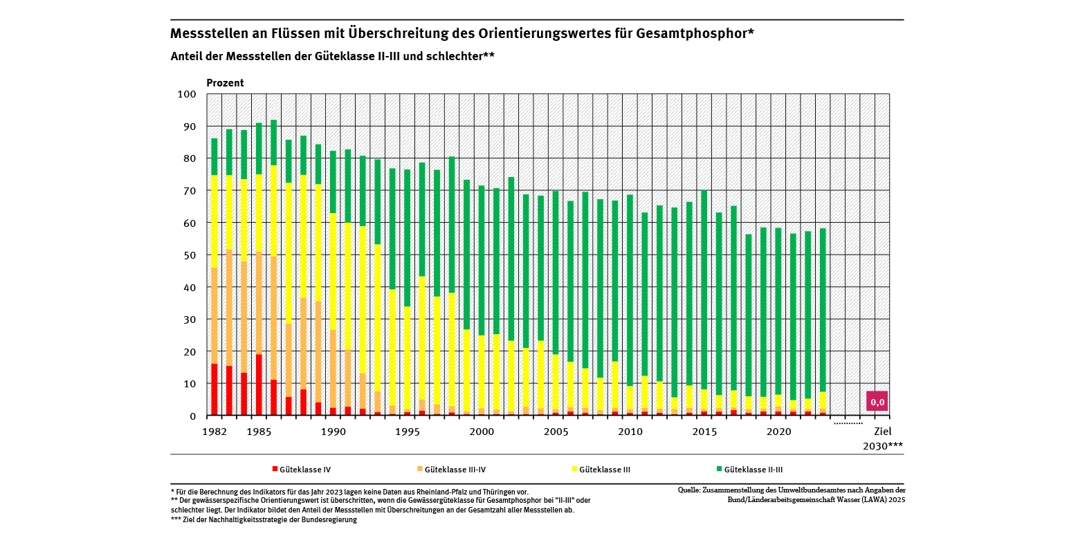 Die Bundesländer übermitteln dem Umweltbundesamt Messwerte von etwa 250 repräsentativen Messstellen. Für die Einordnung in eine Gewässergüteklasse wird der Mittelwert der Phosphor-Konzentration mit der Konzentration verglichen, die für den guten ökologischen Zustand in dem jeweiligen Gewässertyp nicht überschritten werden sollte (OGewV 2016). Sie liegen je nach Fließgewässertyp zwischen 0,1 und 0,15 mg/l Phosphor (bei einem Typ 0,3 mg/l) sowie in Übergangsgewässern bei 0,045 mg/l. Der Indikator entspricht dem Anteil der Messstellen, die diese Orientierungswerte nicht einhalten.
