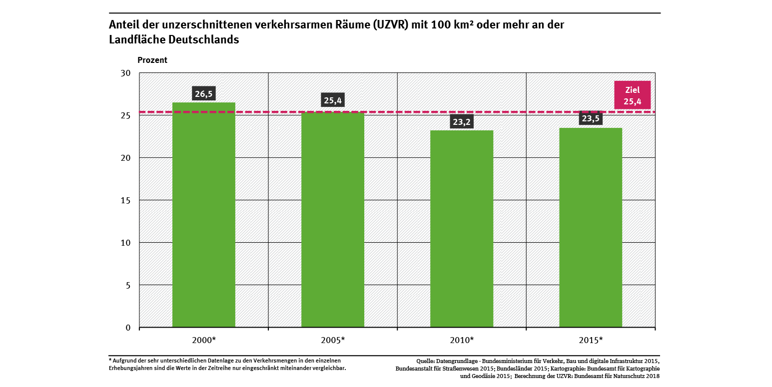 Für den Indikator wird der Anteil der Flächen, die nicht von größeren Verkehrsachsen zerschnitten sind, an der Gesamtfläche Deutschlands berechnet. Als zerschneidende Verkehrsachsen werden Straßen (Autobahnen, Bundes-, Landes- und Kreisstraßen) ab einer Verkehrsstärke von 1.000 Fahrzeugen pro Tag, mindestens zweigleisige oder eingleisige elektrifizierte Bahnstrecken sowie Kanäle mit dem Status einer Bundeswasserstraße gewertet. Diese Flächen können mit Hilfe von Geoinformationssystemen bestimmt werden. Um die Verkehrsstärke der Straßen vollständig zu bestimmen, sind Modellierungen und Zählungen (als Kalibrierungsgrund-lage für die Modellierung) notwendig. Die Modellierungsmethoden sind für das Jahr 2010 bei Bosch & Partner et al. 2013 und für das Jahr 2015 bei SSP Consult Beratende Ingenieure GmbH 2018 beschrieben.