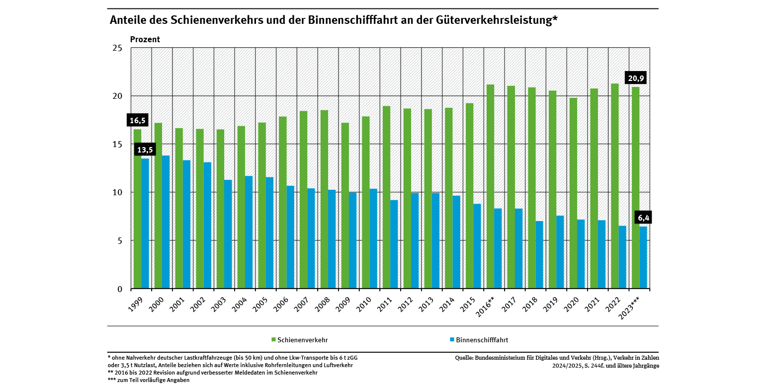 Der Gütertransport auf der Schiene entwickelte sich langfristig positiv: Sein Anteil stieg zwischen 1999 und 2015 von 16,5 % auf 19,2 % an. Ab 2016 kam es infolge einer geänderten Datengrundlage zu einem Sprung und in den letzten Jahren schwankt der Anteil zwischen 19 und 21,5 %. Der Trend bei der Binnenschifffahrt ist eindeutig negativ: Zwischen 1999 und 2023 sank ihr Marktanteil am Güterverkehr fast kontinuierlich. Insgesamt hat aufgrund des starken Wachstums des Straßengüterverkehrs der Anteil des Gütertransports durch Bahn und Binnenschiffe an der gesamten Güterverkehrsleistung leicht abgenommen.
