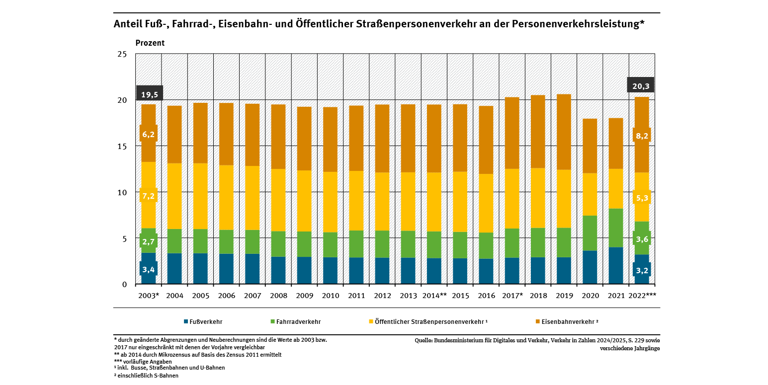 Wir werden immer mobiler: Zwischen den Jahren 1976 und 2019 hat sich der Personenverkehr in Deutschland auf rund 1.246 Milliarden Personenkilometer fast verdoppelt. Der Anteil des Umweltverbundes lag 1976 noch bei rund 24 %, im Jahr 2019 bei 20,6 % und sank pandemiebedingt in den Jahren 2020 und 2021 auf rund 18 %. Im Jahr 2022 lag er mit 20,3 % wieder auf einem ähnlichen Niveau wie 2019.