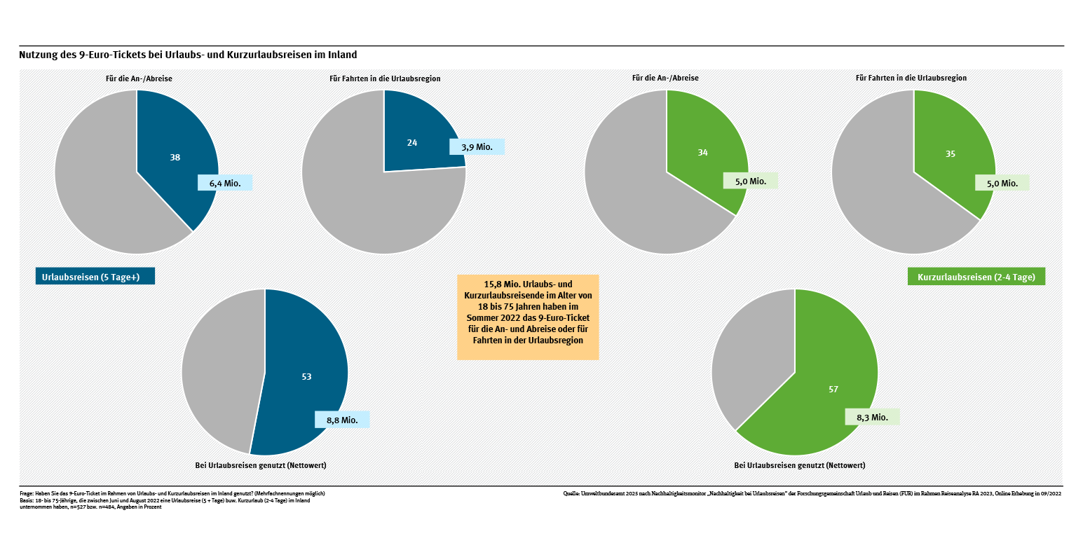 In den Jahren 2020 und 2021 waren die Reisenden wegen der Corona-Pandemie klimafreundlicher unterwegs als in den Jahren zuvor: Es wurde weniger gereist, die gereisten Distanzen waren insgesamt kürzer und die Verkehrsmittelwahl war klimafreundlicher. In den Jahren 2022 und 2023 ist das Reiseverhalten der Deutschen Wohnbevölkerung schnell wieder zu vorpandemischen Verhältnissen zurückgekehrt. Die Summe der mit dem Flugzeug bei Urlaubsreisen zurückgelegten Kilometern übertrifft 2023 bereits den bisherigen Höchstwert von 2019 (siehe Abb. „Gesamtverkehrsleistung bei allen Urlaubsreisen“).