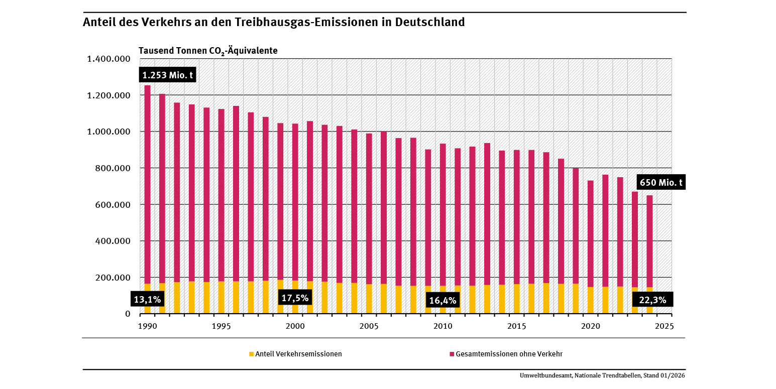 Während die Treibhausgasemissionen in Deutschland seit 1990 stark gesunken sind, gab es im Verkehrssektor bisher kaum eine Verbesserung. Der Anteil des Verkehrs an den Gesamtemissionen ist seit 1990 von 13,1 % auf etwa 22,3 % im Jahr 2024 gestiegen. Das lag vor allem am stetig wachsenden Straßengüterverkehr, dem Motorisierten Individualverkehr und dem zunehmenden Absatz von Dieselkraftstoff (siehe Abb. „Anteil des Verkehrs an den Treibhausgas-Emissionen in Deutschland“).