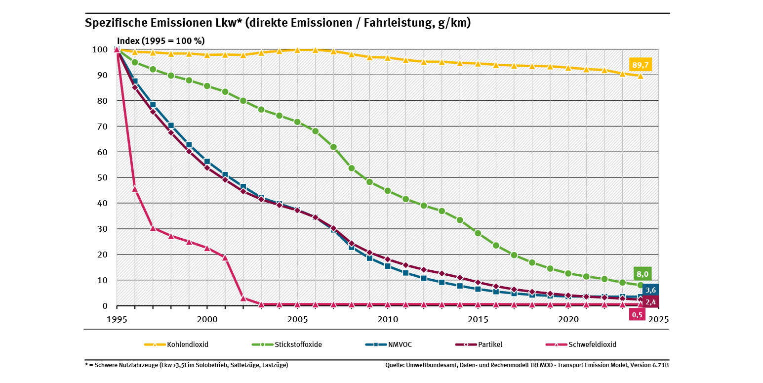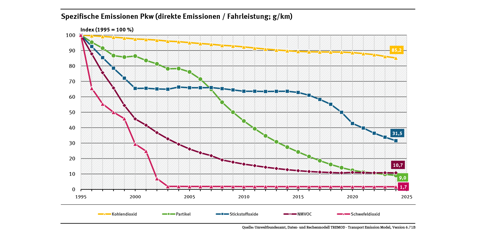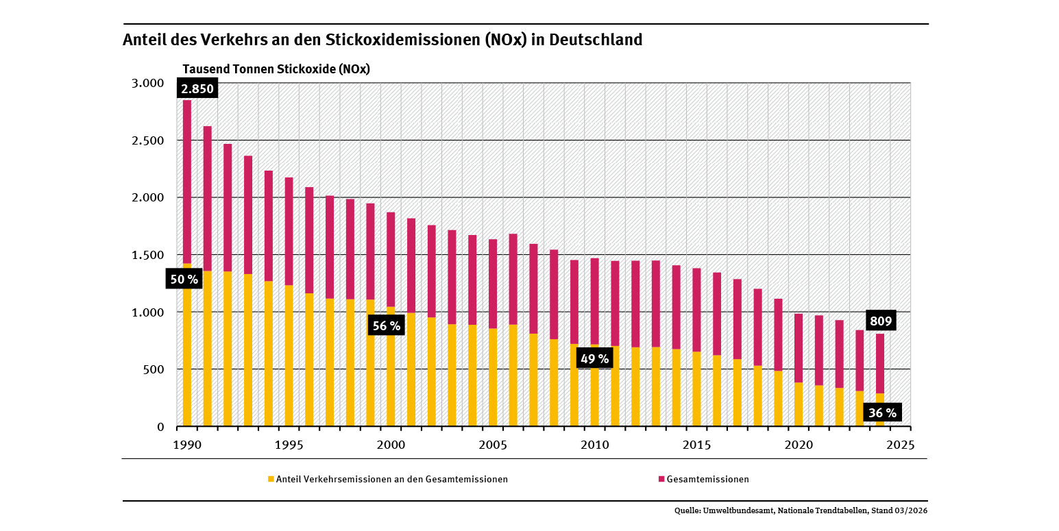 2024 verursachte der Verkehr 36 % der Emissionen von Stickstoffoxiden in die Luft (siehe Abb. „Anteil des Verkehrs an den Stickoxidemissionen (NOx) in Deutschland“). Der Anteil an den Feinstaubemissionen lag 2024 bei 20 %. Absolut betrachtet sind die Partikelemissionen des Verkehrs seit 1995 um rund 60 % gesunken (siehe Abb. „Anteil des Verkehrs an den Partikelemissionen (PM10) in Deutschland“). Hauptverursacher ist jeweils der motorisierte Straßenverkehr. Besonders in Ballungsräumen ist die Luft stark mit Stickstoffdioxid belastet (siehe „Luftbelastung in Ballungsräumen“).