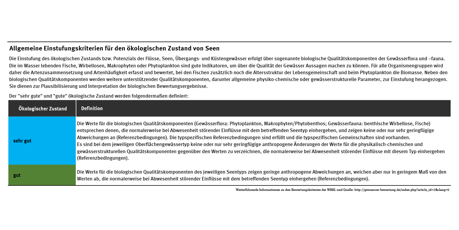 Bewertet nach der WRRL, erreichten 2015 nur 26,4 % der 732 deutschen Seen einen guten oder sehr guten ökologischen Zustand bzw. ein „gutes“ oder das „höchste“ ökologische Potenzial (siehe Abb. „Anteil der Wasserkörper in Seen in mindestens „gutem“ Zustand oder mit mindestens „gutem“ Potenzial“ und Tab. „Allgemeine Einstufungskriterien für den ökologischen Zustand von Seen“). Ein Trend ist noch nicht ableitbar, denn die Erhebung findet nur alle 6 Jahre statt und ein Vergleich mit den Bewertungsergebnissen aus 2010 ist nicht möglich. Aus 2010 lagen für mehr als 20 % der deutschen Seen keine vergleichbaren Daten vor. Mit neuen ökologischen Bewertungsdaten ist im Laufe des Jahres 2022 zu rechnen.