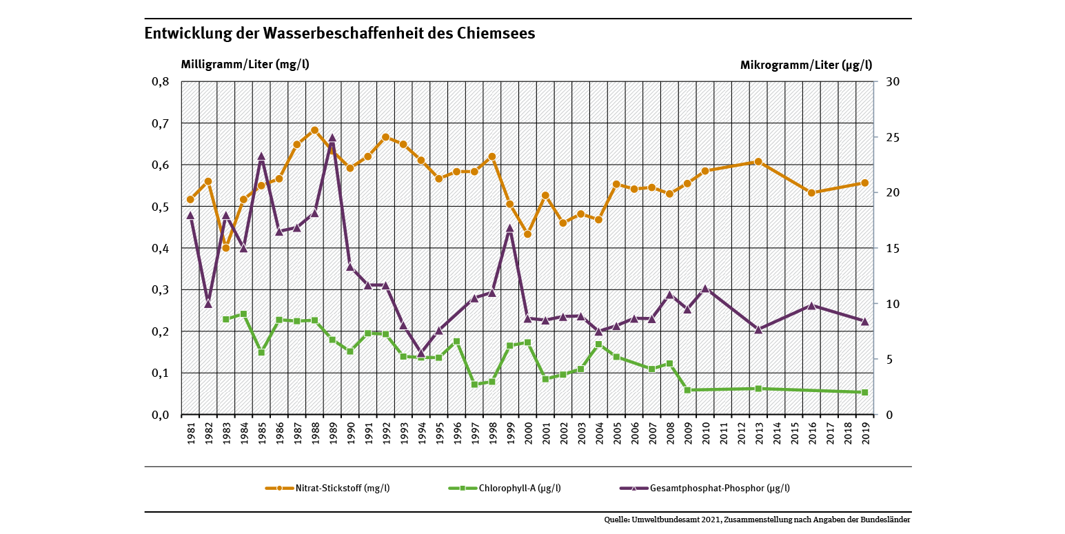 Der Chiemsee und der Starnberger See sind natürlicherweise nährstoffarm. Beide Seen waren in den 1970er Jahren durch die Einleitung ungeklärter Abwässer und intensive Bewirtschaftung der Felder und Wiesen überdüngt. Sie nähern sich jedoch wieder ihrem natürlichen Zustand an. Für den guten ökologischen Zustand gilt für beide Seen ein typspezifischer Orientierungswert (nach Oberflächengewässerverordnung) für Gesamtphosphor von höchstens 8 Mikrogramm pro Liter (µg/l) im Jahresmittel.