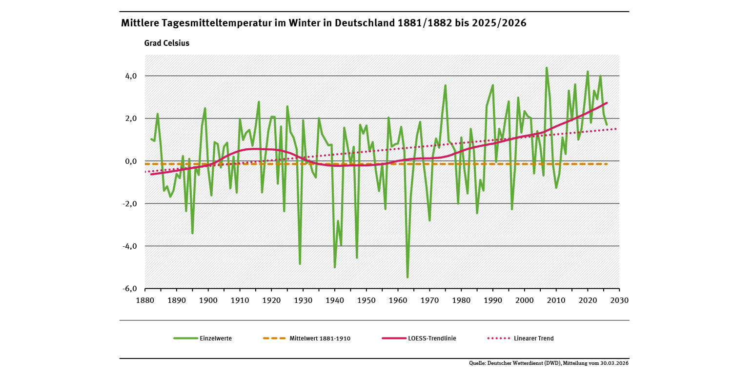 Mittlere Tagesmitteltemperatur im Winter in Deutschland 1881 bis 2025