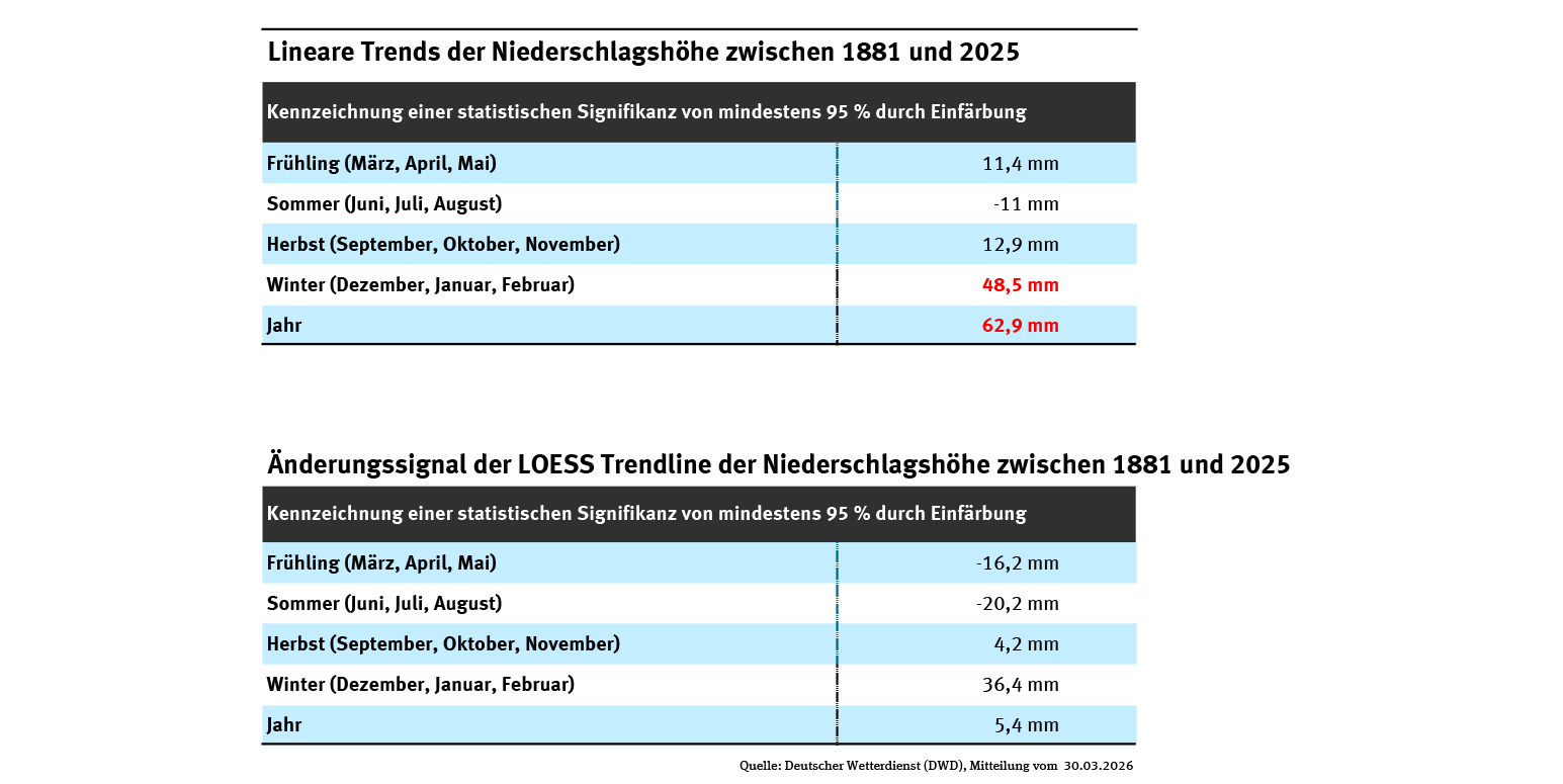 Tab: Lineare Trends der Niederschlagshöhe zwischen 1881 und 2025