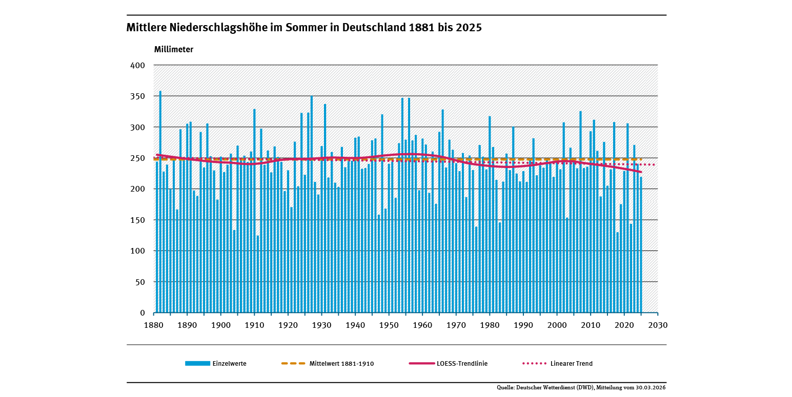 Mittlere Niederschlagshöhe im Sommer in Deutschland 1881 bis 2025