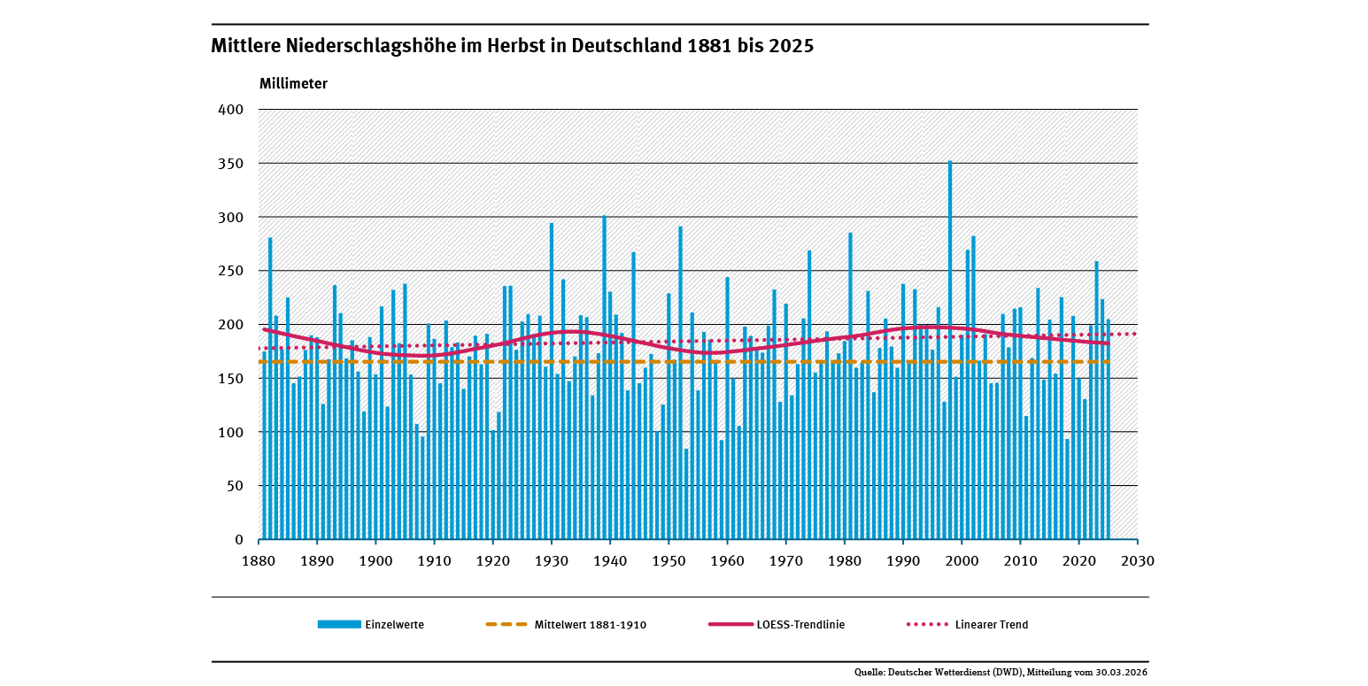 Mittlere Niederschlagshöhe im Herbst in Deutschland 1881 bis 2025