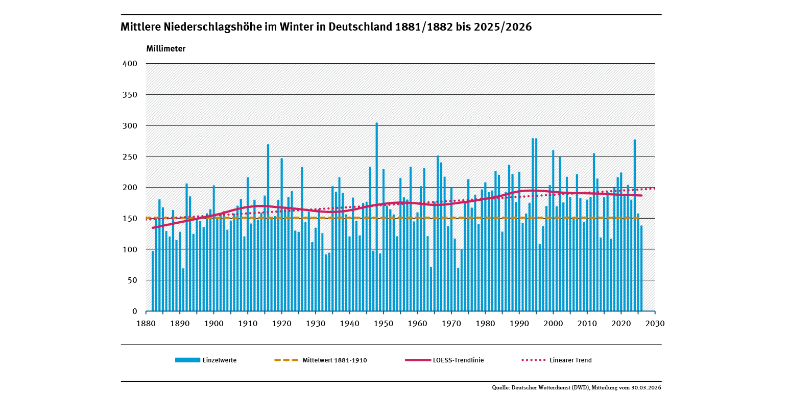 Mittlere Niederschlagshöhe im Winter in Deutschland 1881/1882 bis 2025/2026
