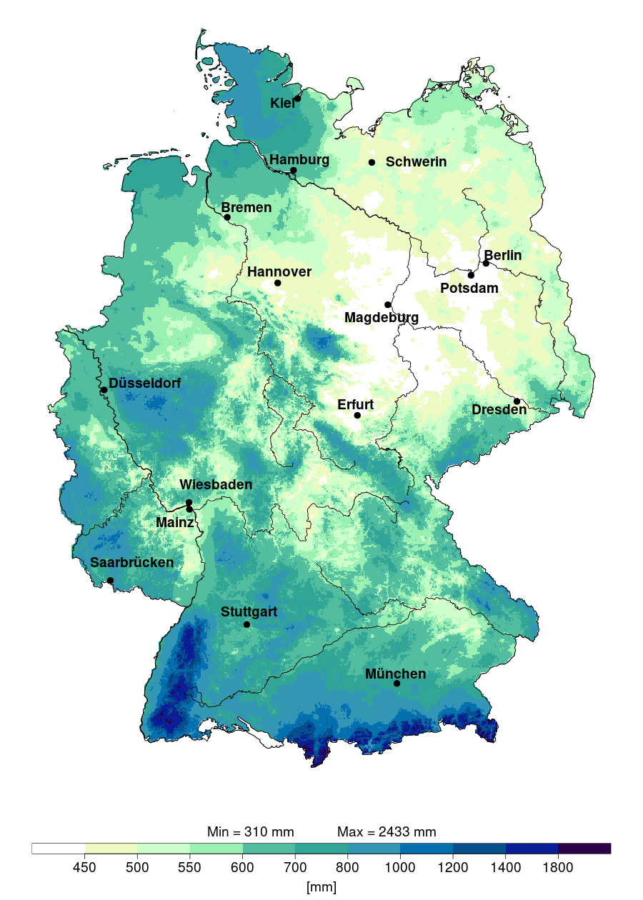 Jährliche mittlere Niederschlagshöhe in Deutschland 1881 bis 2025