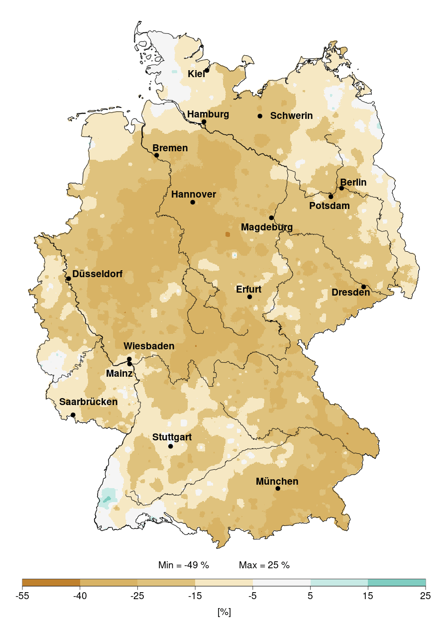 Karte: Veränderung der jährlichen Niederschläge in Deutschland im Jahr 2025 (in Prozent)