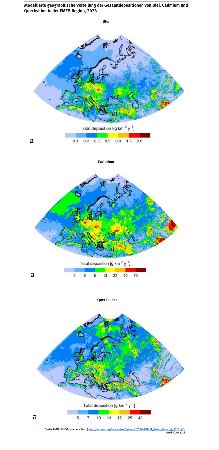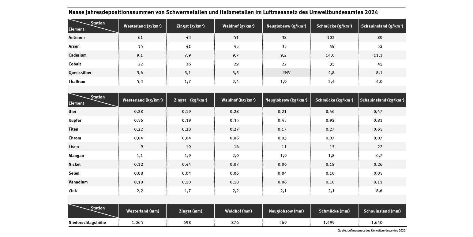 Nasse Jahresdepositionssummen von Schwermetallen und Halbmetallen im Luftmessnetz des UBA 2024