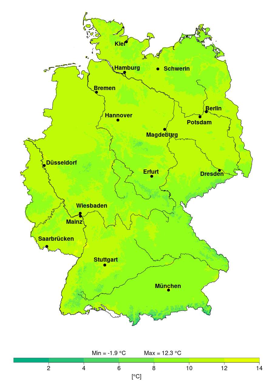 Jährliche mittlere Tagesmitteltemperatur in Deutschland 1881 bis 2025