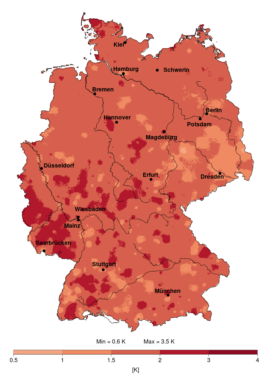 Karte: Veränderung der durchschnittlichen Lufttemperatur in Deutschland im Jahr 2025 (in Kelvin)