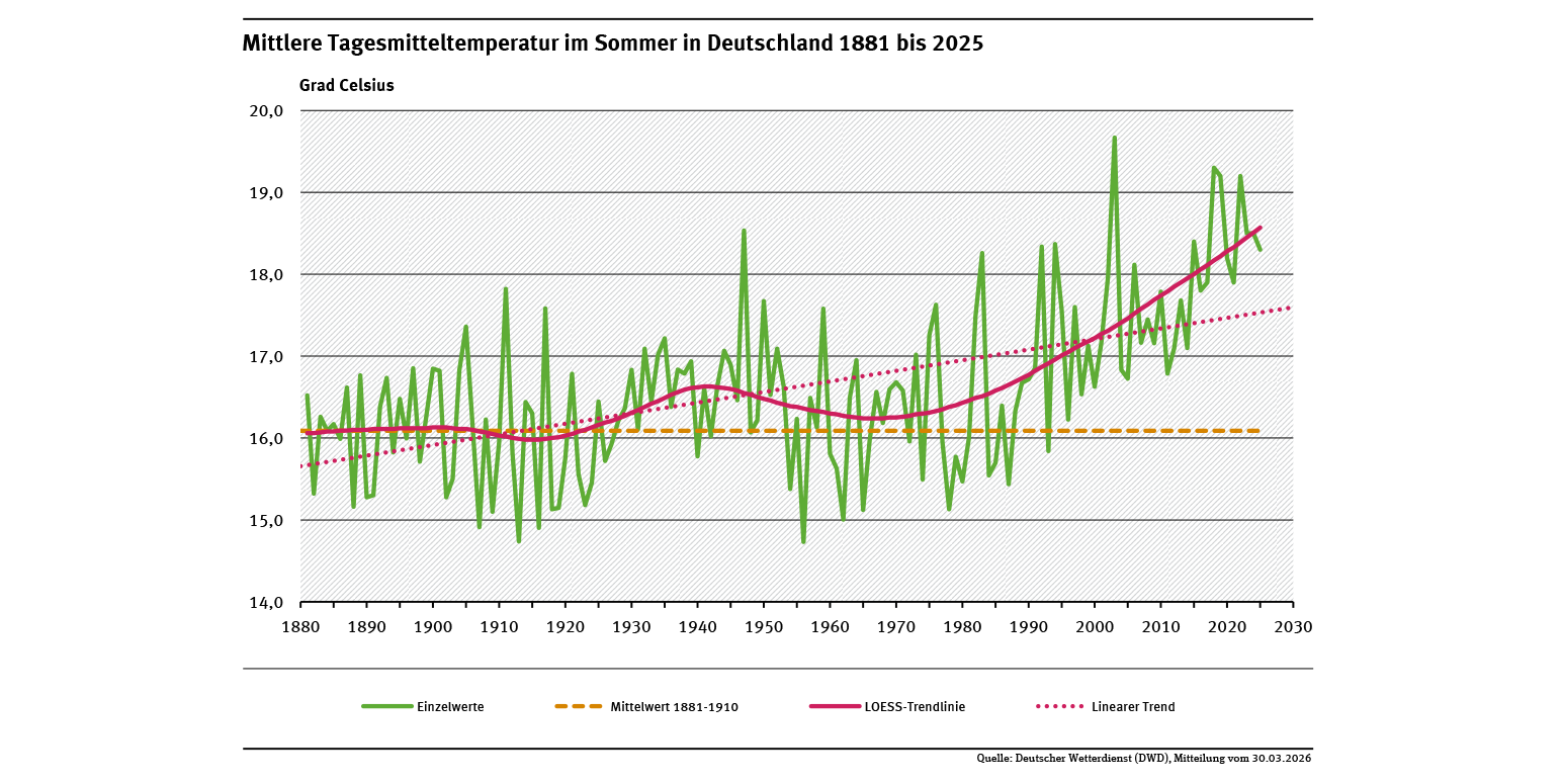 Mittlere Tagesmitteltemperatur im Sommer in Deutschland 1881 bis 2025
