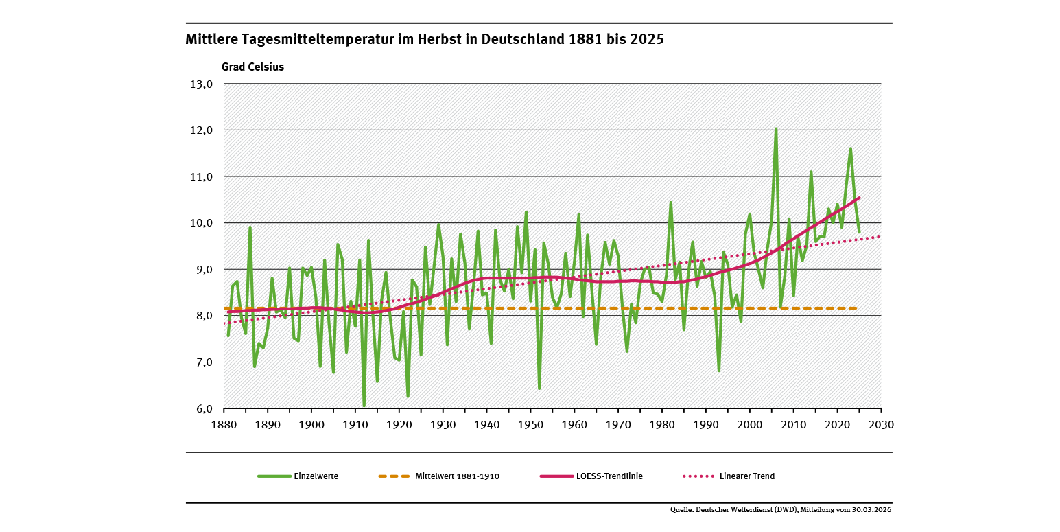 Mittlere Tagesmitteltemperatur im Herbst in Deutschland 1881 bis 2025