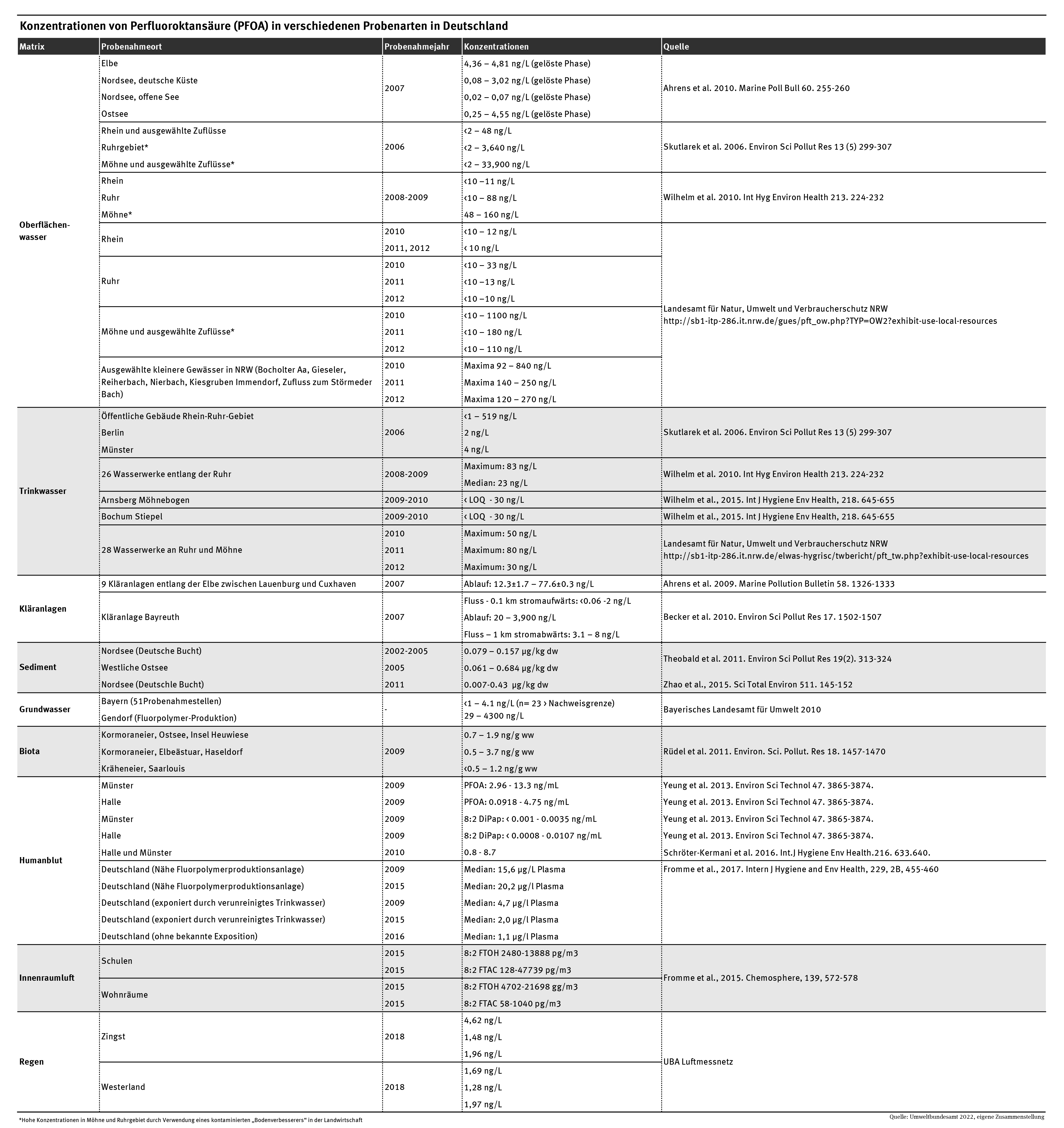 Tab: Konzentrationen von Perfluoroktansäure (PFOA) in verschiedenen Probenarten in Deutschland