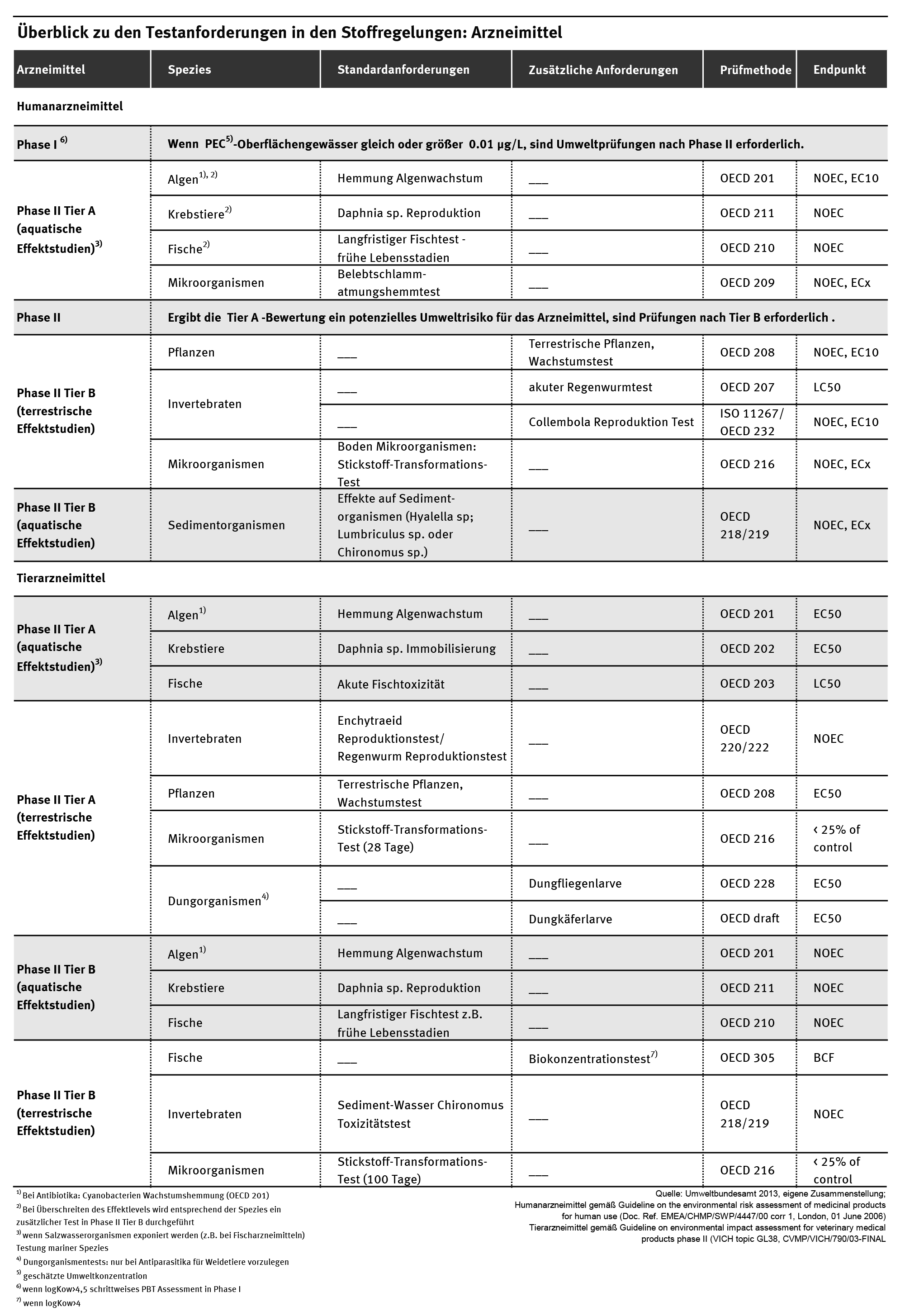 Tab: Überblick zu den Testanforderungen in den Stoffregelungen: Arzneimittel