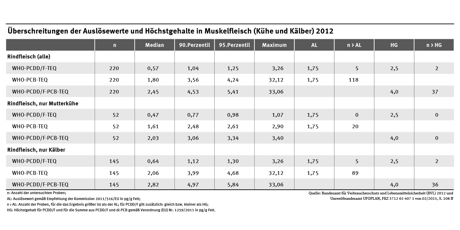Tab: Überschreitungen der Auslösewerte und Höchstgehalte in Muskelfleisch (Kühe und Kälber) 2012