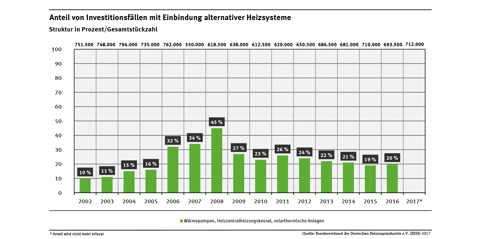 Anteil von Investitionsfällen mit Einbindung alternativer Heizsysteme