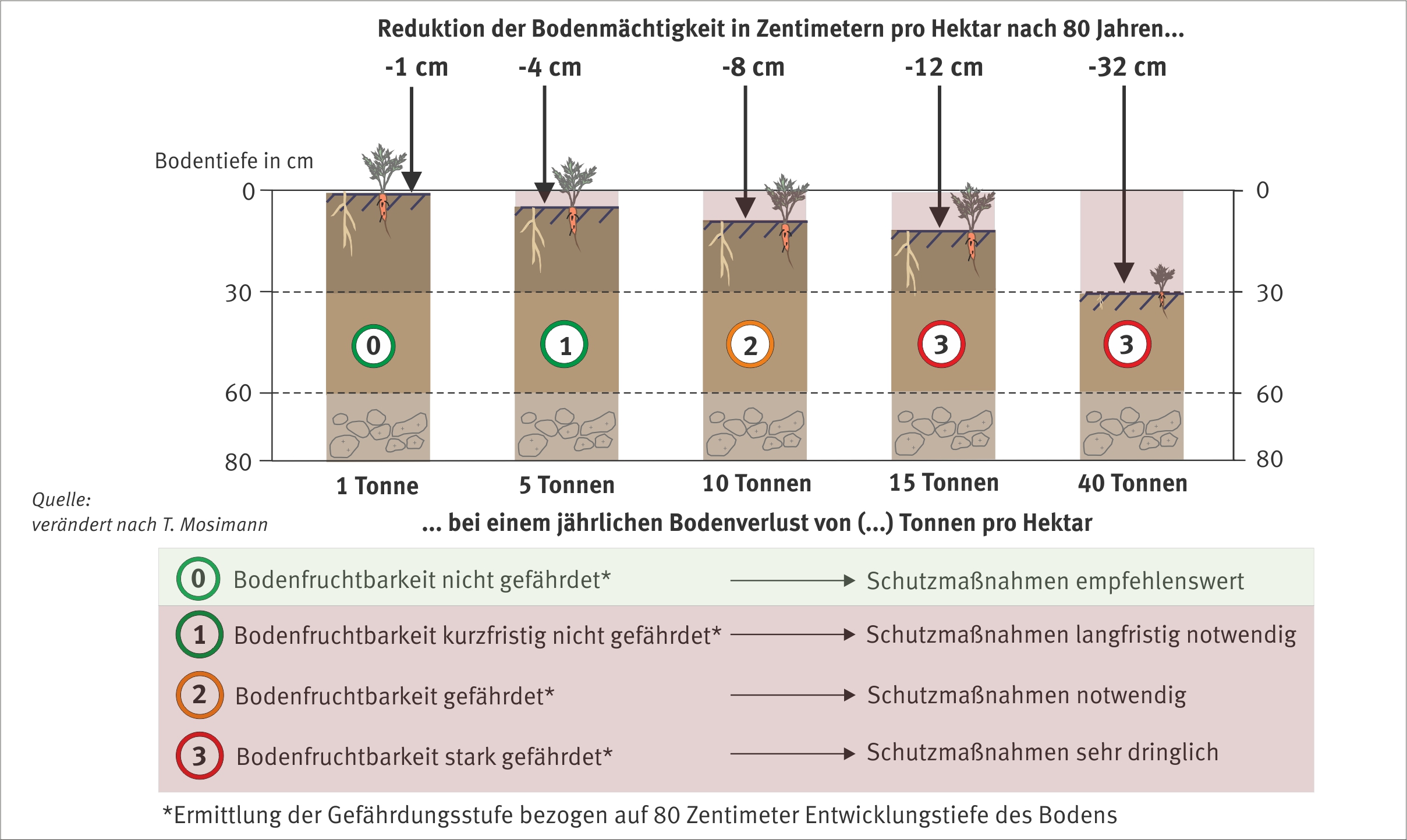 Bodenverlust nach 80 Jahren bei bestimmten jährlichen Abtragsmengen.