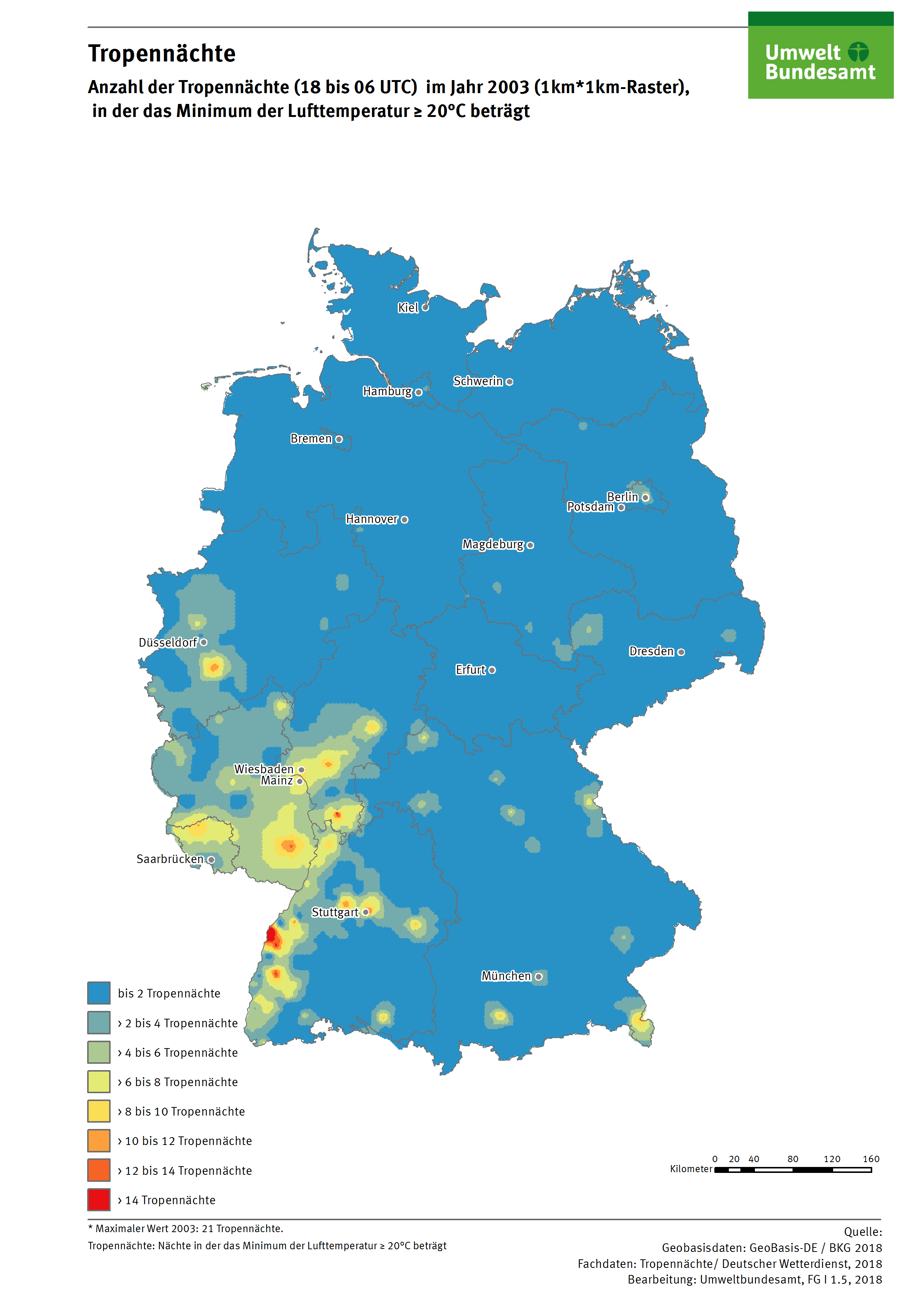 Karte: Tropennächte - Anzahl der Tropennächte (18 bis 06 UTC) im Jahr 2003