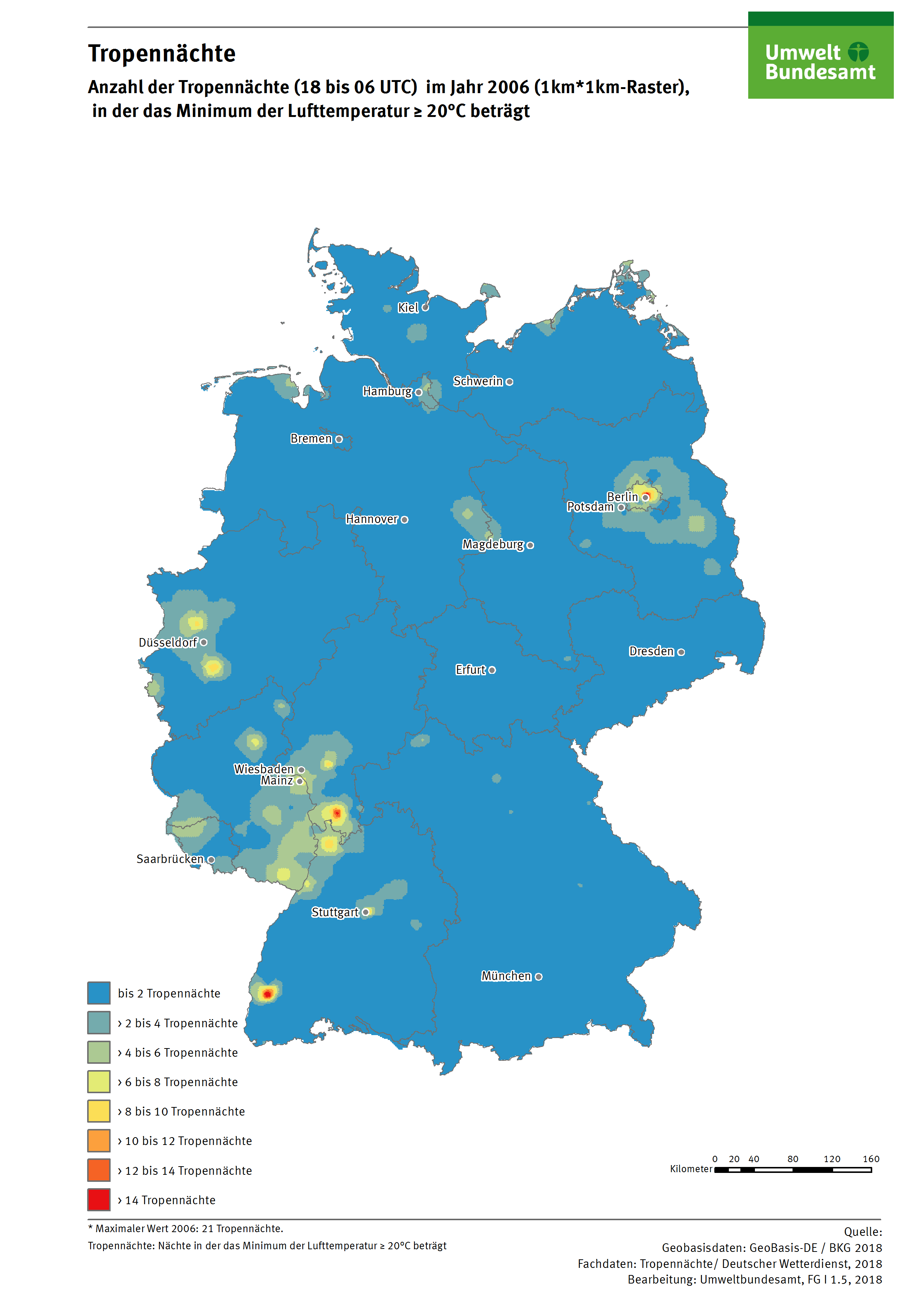 Karte: Tropennächte - Anzahl der Tropennächte (18 bis 06 UTC) im Jahr 2006