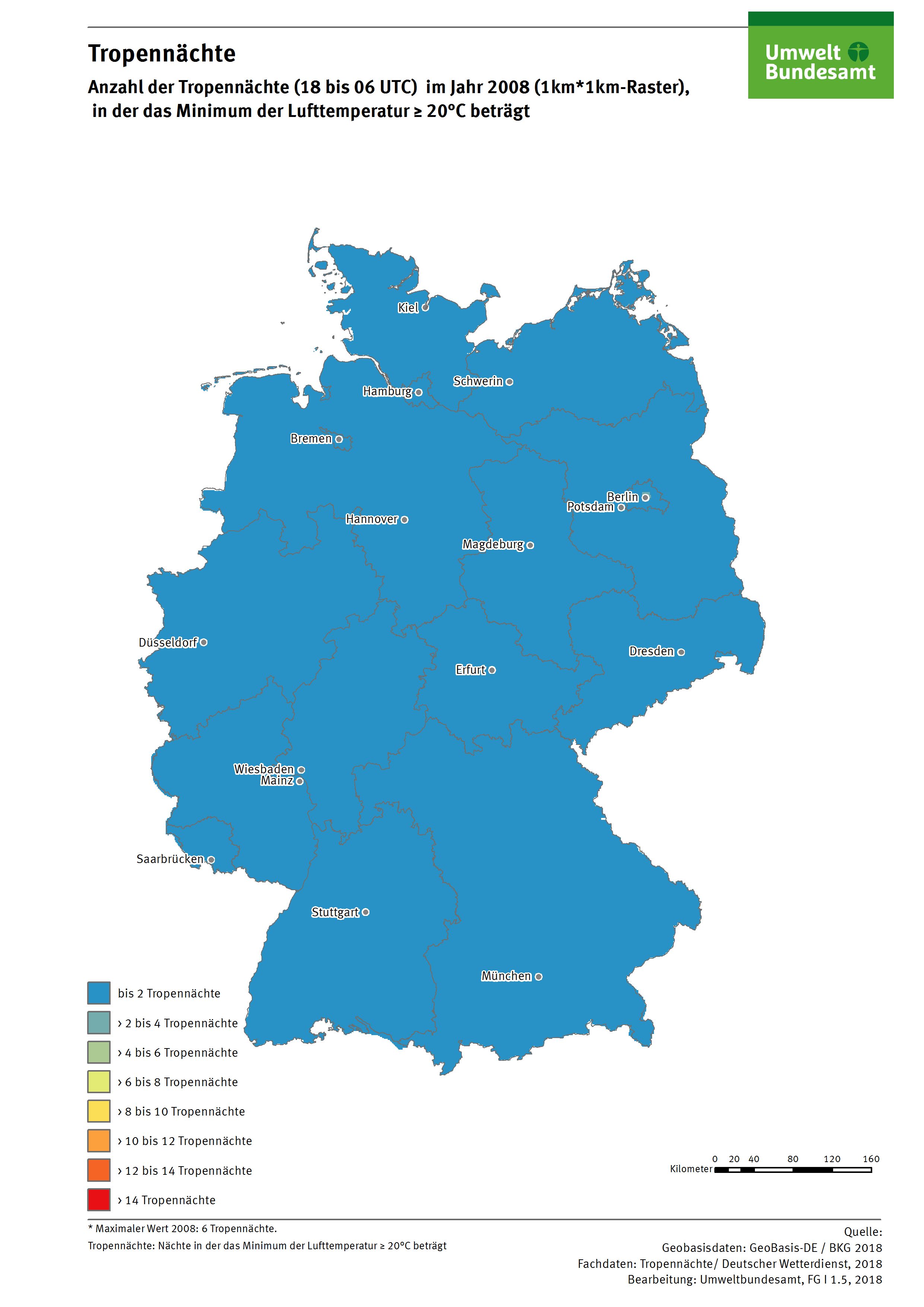 Karte: Tropennächte - Anzahl der Tropennächte (18 bis 06 UTC) im Jahr 2008