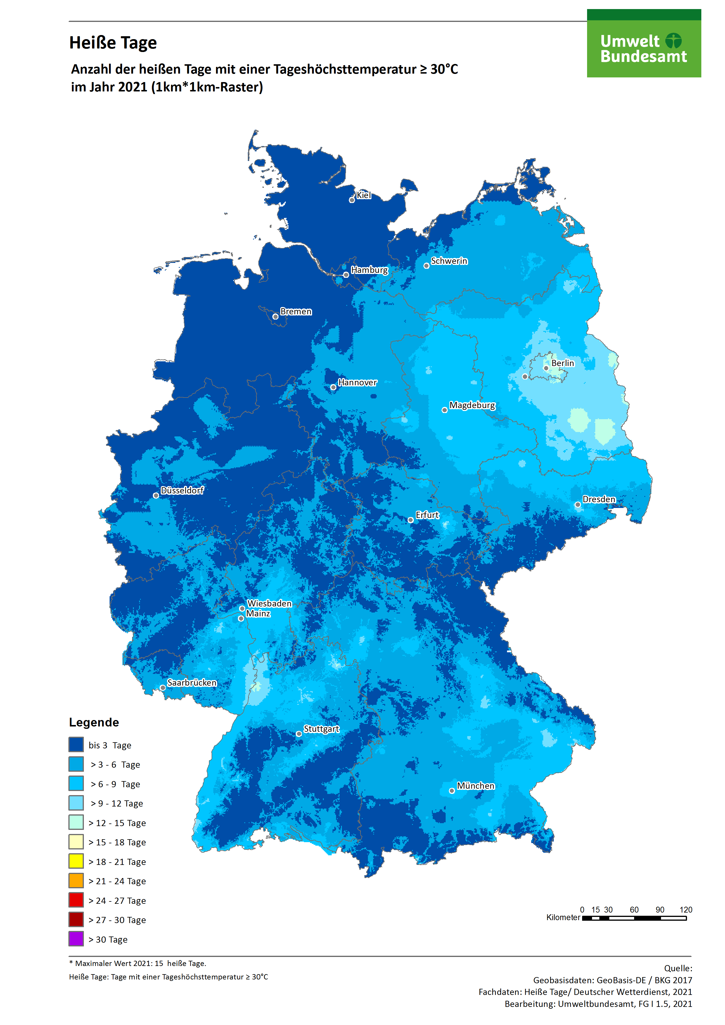 Karte: Heiße Tage - Anzahl der Heißen Tage mit einer Tageshöchsttemperatur >= 30°C im Jahr 2021