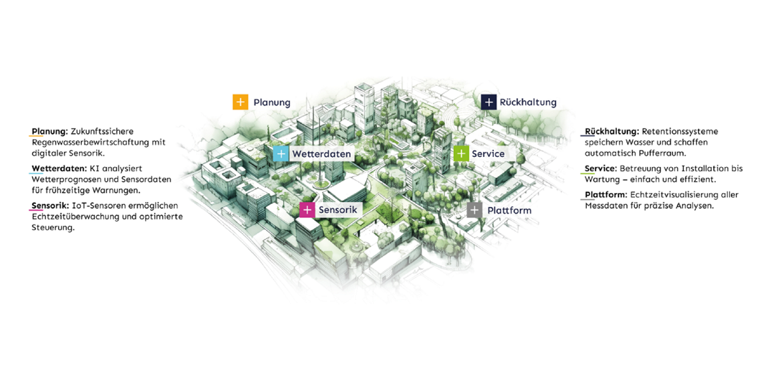 Besonders im Wassersektor zeigen sich vielfältige Möglichkeiten, wie digitale Technologien naturbasierte Lösungen stärken können; einige Beispiele beleuchten Real Perdomo et al. (2025) genauer. Beispielhaft für ganzheitliche Anwendungen sind die Lösungen der Firma RX-Watertec. Das gleichnamige System erfasst Echtzeit-Füllstandinformationen aus Zisternen, Baumsensorik und Wetterdaten. Damit evaluiert es live, ob Bäume autonom bewässert werden sollten oder aufgrund eines vorausgesagten Regens keine Beregnung nötig ist sowie ob die Zisternen wegen einer Starkregenvorhersage geleert werden sollen, um Schäden zu reduzieren. Die Digitalisierung der Regenwasserbewirtschaftung ermöglicht es auch, Wartungen bedarfsgerecht und somit ressourcenschonender und kostengünstiger durchzuführen.