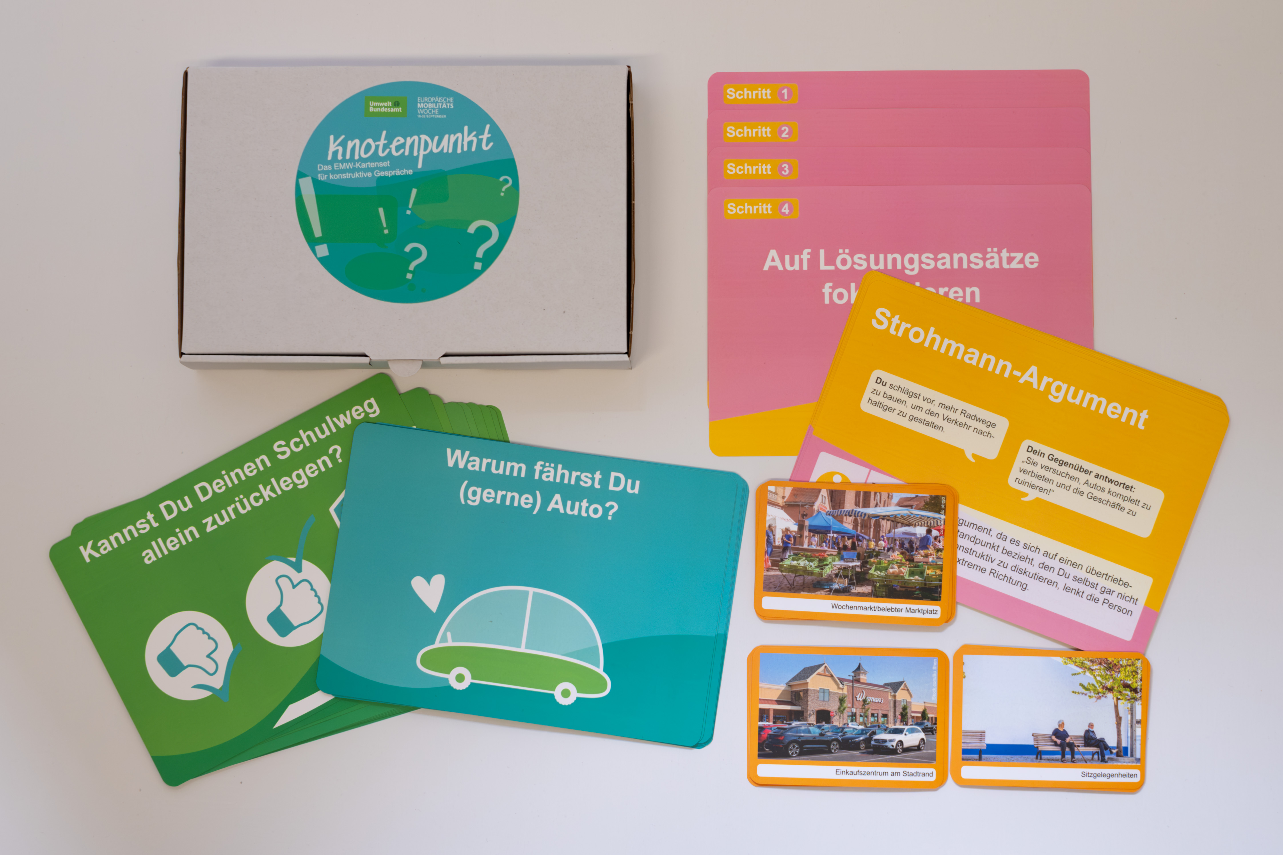 - Die türkisfarbenen Karten enthalten acht Fragen rund ums Auto, die sich am Beteiligungsstand nutzen lassen, um mit Personen ins Gespräch zu kommen, die hauptsächlich mit dem Pkw unterwegs sind.
