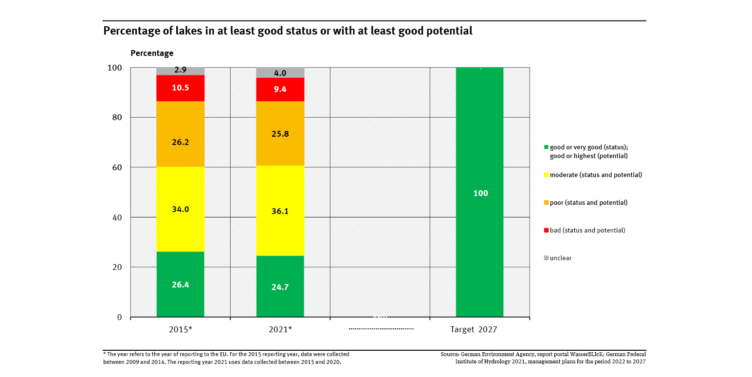 • In 2021 24.7 % of the lakes in Germany were in at least good ecological status or showed at least a good ecological potential.
