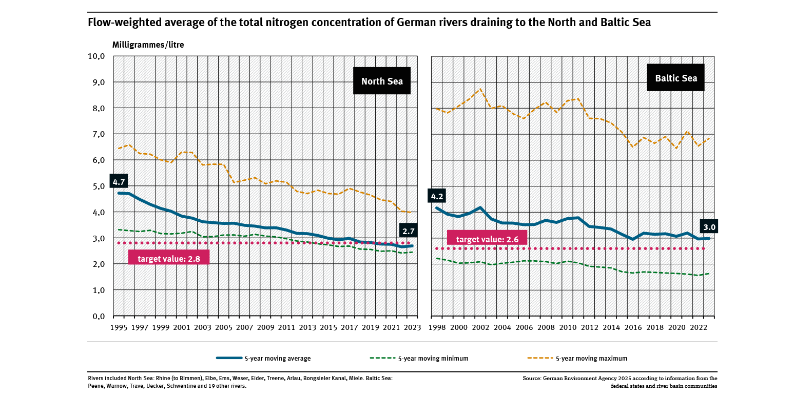 In order to achieve the EU Water Framework Directive (WFD, 2000/60/EG) and the EU Marine Strategy Framework Directive (MSFD, 2008/56/EG), the German Surface Waters Ordinance sets management target values for the rivers running into the North Sea and Baltic Sea (OGewV 2016, in German only): 2.6 milligrammes of total nitrogen per litre (mg/l) for rivers flowing into the Baltic Sea and 2.8 mg/l for those flowing into the North Sea. These target values were also adopted for the German Sustainable Development Strategy.