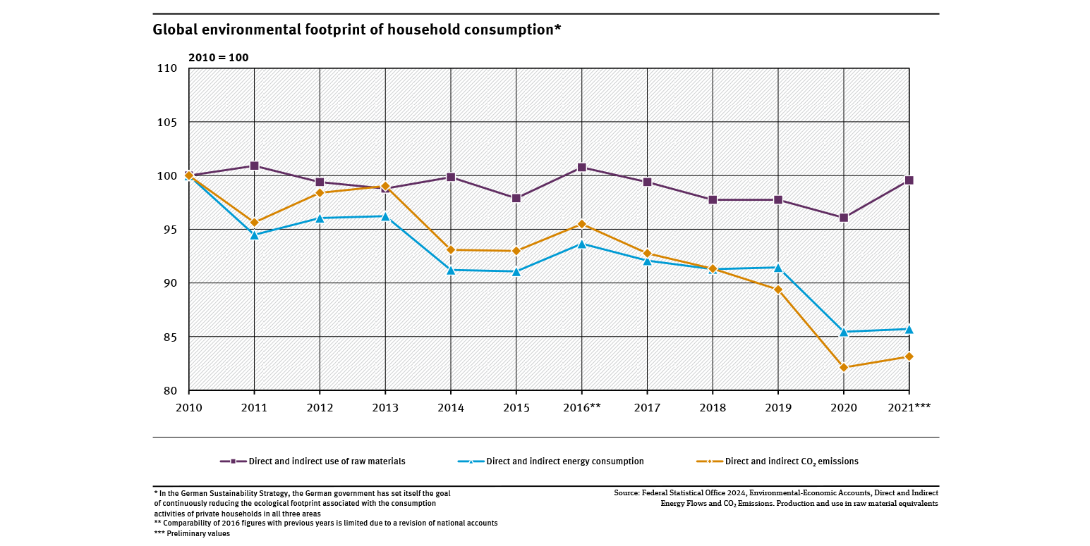 When the three sub-indicators are viewed together, the picture is mixed: While the use of raw materials is stagnating and requires further efforts to achieve the German government’s target, energy consumption and CO₂ emissions are moving in the desired direction.