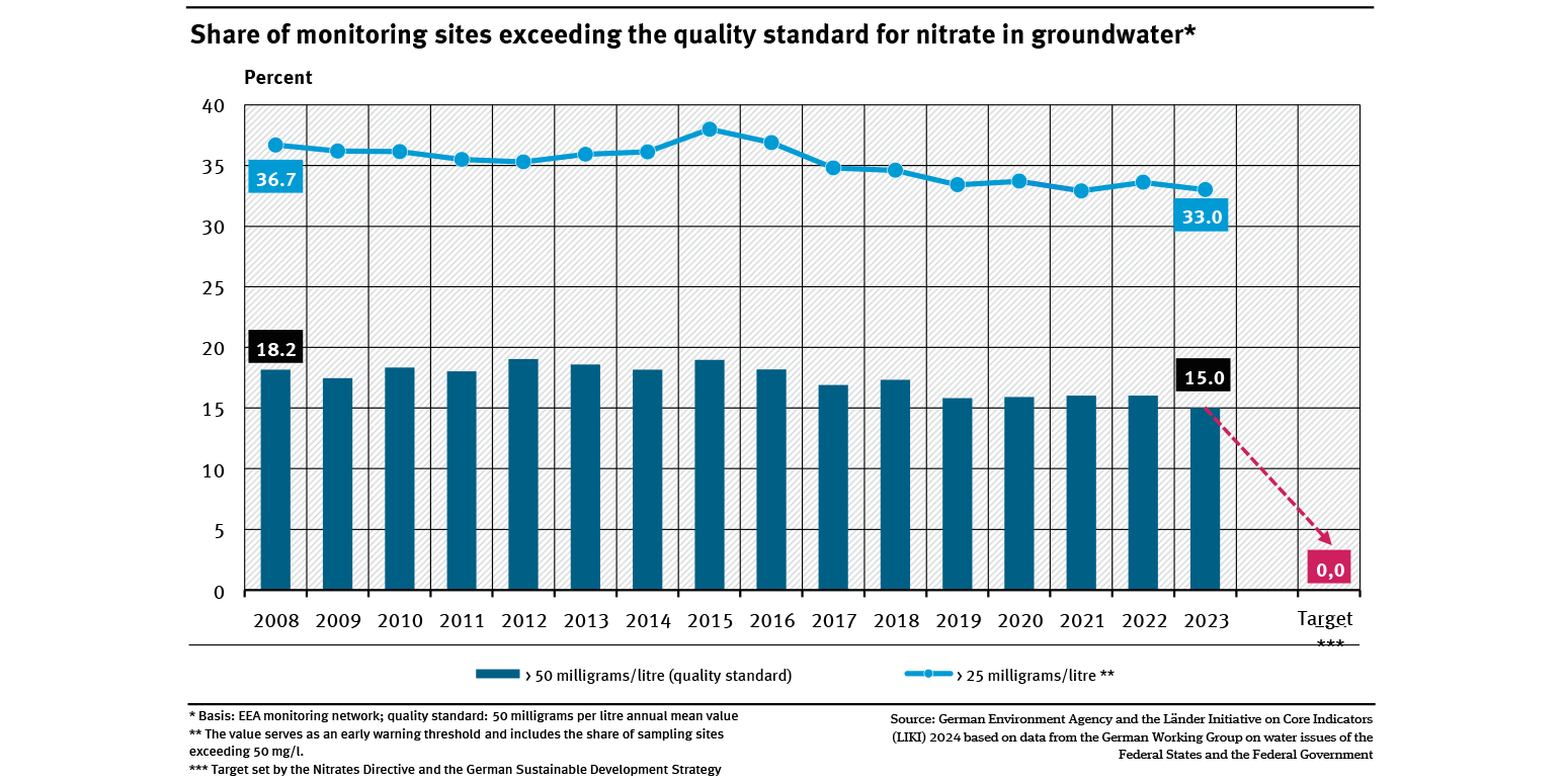 The aim of the European Nitrates Directive (EU Directive 91/676/EWG) is to prevent pollution of groundwater by agricultural nitrate inputs. Governments are obliged to develop action plans to prevent nitrate concentrations above 50 mg/l. Since 2016, compliance with the nitrate quality standard has also been a goal of the German Sustainable Development Strategy. Since 2008, the share of monitoring sites which exceed the quality standard lies between 15 and 19 %. The share of monitoring sites with a nitrate concentration above 25 mg/l has also stagnated since 2008 at around 33–38 %.