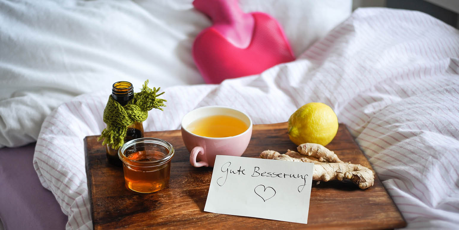 Photo of a bed featuring a hot water bottle and a serving board with a glass of honey, a cup of tea, ginger root, a lemon and a note saying “Get well soon”. Home remedies for mild symptoms