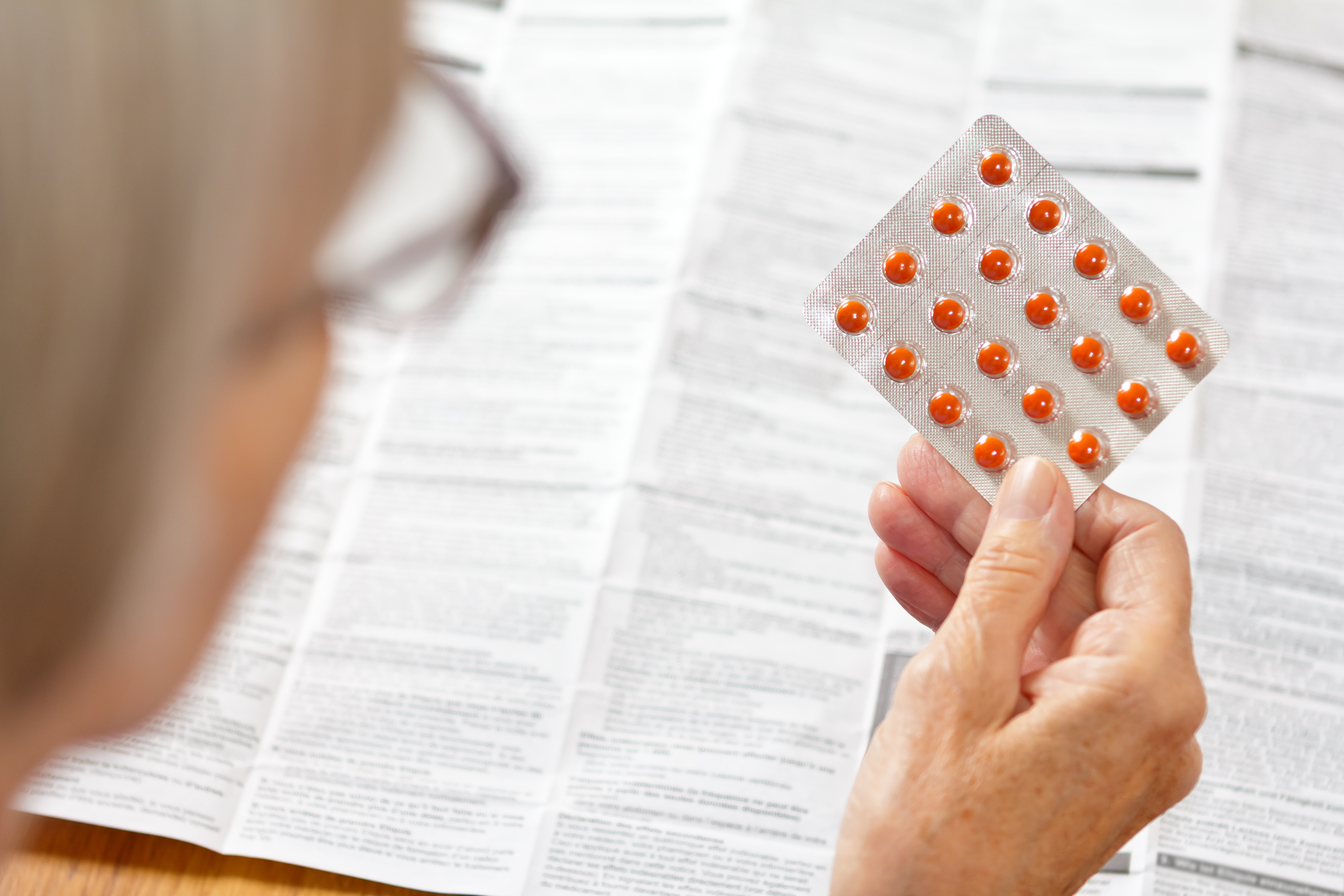 Elderly woman holds a blister pack with orange pills, large package leaflet in the background Follow the package leaflet for the sake of the environment