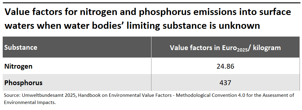 For unknown pathways, environmental damages related to nitrogen emissions into surface waters are estimated to amount to 25 € per kilogram, whereas for phosphorus the estimate is 437 €/kg emitted into surface waters.