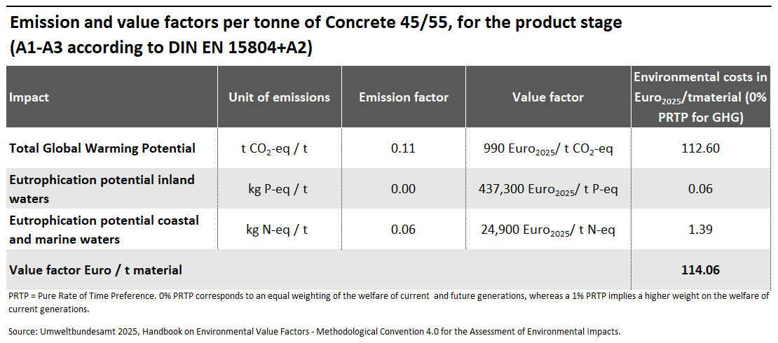 Environmental impacts of concrete 45/55 related to greenhouse gas emissions and eutrophication amount to 114€ per metric ton.