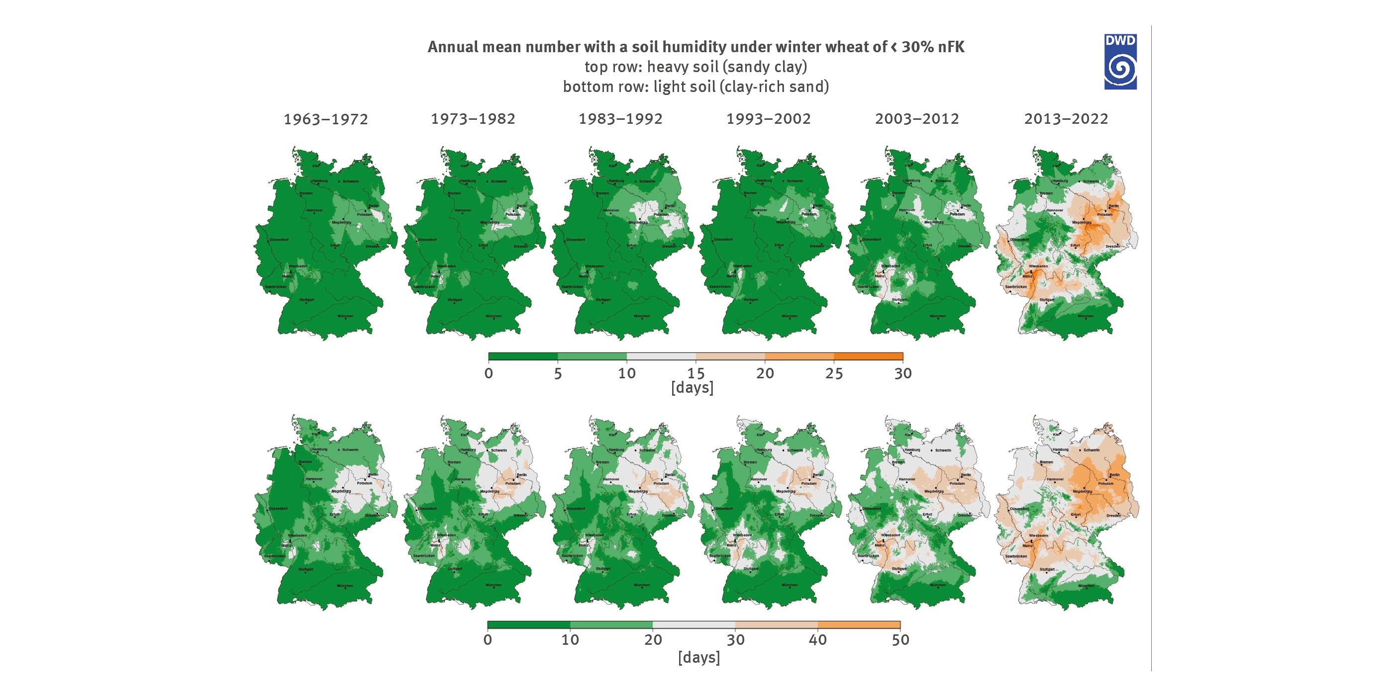 The chart consists of two rows of six nationwide maps each of Germany. The top row of maps shows the annual mean number of days with a soil humidity of less than 30 per cent usable field capacity for winter wheat on sandy clay, while the number of days in the bottom row refers to clay-rich sand. The six maps each cover the following periods: 1963–1972, 1973–1982, 1983–1992, 1993–2002, 2003–2012 and 2013–2022. The range for the top row is spread over 5 equidistant categories from 0 days (in shades of green) to the maximum of 30 days (in shades of orange). For the bottom row the range is spread over 5 equidistant categories from 0 to 50 days. Looking towards the right, the maps are increasingly dominated by shades of orange. There is a distinct focal area in the north-eastern part of Germany, and in later years, also in the Rhine area between Stuttgart and Frankfurt. In the bottom row of maps, the orange-coloured areas on the most recent map extend to almost the whole of Germany, except for the south of Bavaria and Baden-Württemberg, the Bavarian/Upper Palatinate forest, the Fichtel Mountains and the Erz Mountains on Germany’s eastern border as well as the western uplands where the areas are still coloured green.