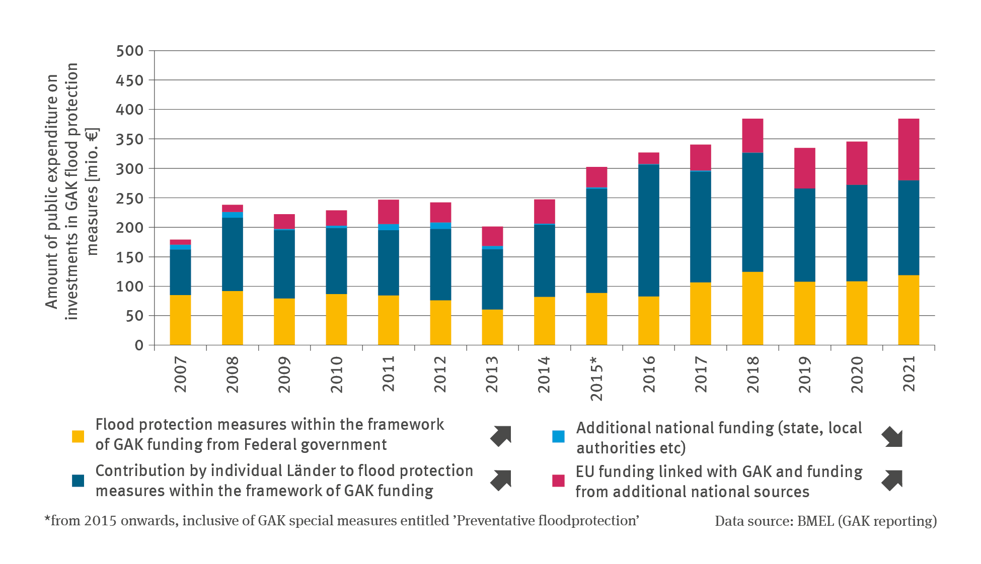 The stacked columns chart WW-R-2 ‘GAK funds for flood protection’ shows the amount of public expenditure on investments made in flood protection measures in million Euros from Federal Government funding, Länder funding, and from additional national funding as well as EU funding during the time series 2007 to 2021. The expenditure has increased significantly since 2013 reaching its highest point in 2018 with just under 400 million Euros. It was possible to reach the same level in 2021. Additional national means played a role only until 2015, having contributed to the overall investments to a minor extent. All other categories show a rising trend. Overall it can be said that the annual contribution from Länder funds is the highest.