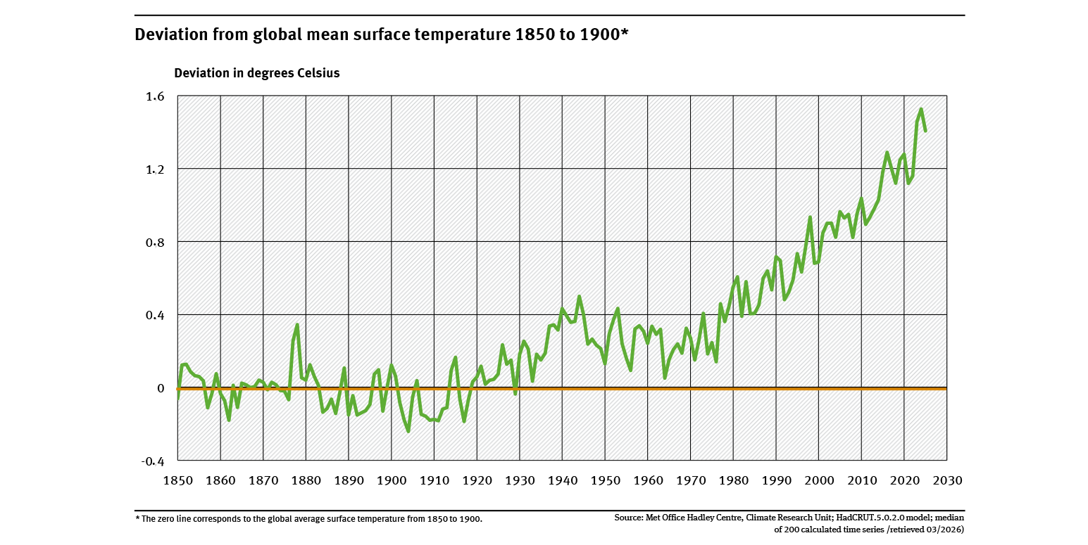 To prevent dangerous interference to the climate system, the aim is to limit the temperature increase to well below 2 degrees Celsius (°C) above pre-industrial levels, and even to 1.5 °C. This is the Paris Agreement adopted by the global community at the 2015 Climate Conference in Paris (UNFCCC 2015). To meet this target, global greenhouse gas emissions must be reduced rapidly and substantially (cf. ‘Greenhouse gas emissions’ indicator), to achieve global greenhouse gas neutrality by 2050 at the latest.