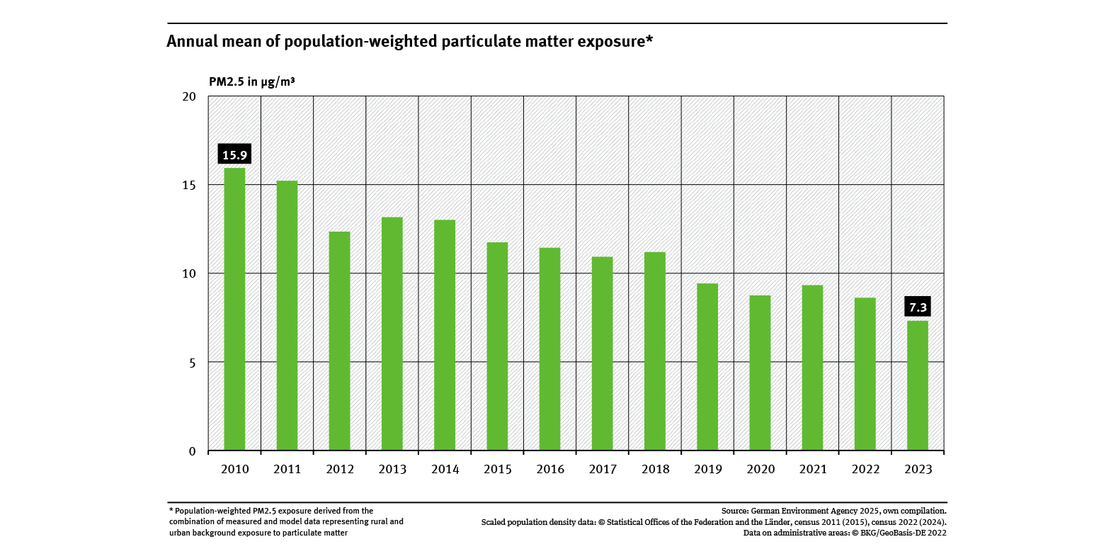 • Population-weighted PM2.5 exposure in Germany was significantly lower in 2023 compared to 2010.