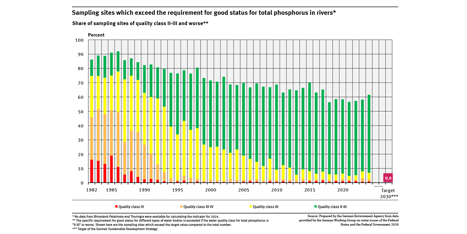 In the early 1980s, excessive phosphorus concentrations were measured at almost 90 % of sampling sites. Since 2018 this share has remained slightly below 60 %. Major improvements can be seen across the different quality classes: overall, the proportion of more heavily polluted water bodies has declined. This improvement has been driven primarily by the introduction of phosphate-free detergents and the expansion of third treatment stage including phosphate precipitation in larger sewage treatment plants since the 1990s.