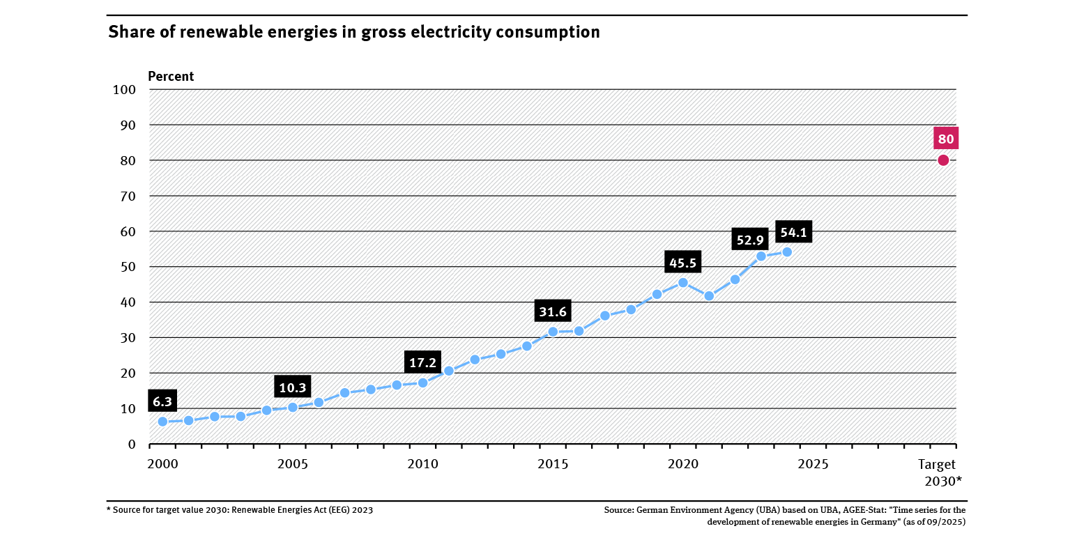 Until just a few years ago, electricity generation in Germany was predominantly based on fossil and nuclear energy sources. Hard coal and lignite in particular caused high greenhouse gas emissions. By contrast, electricity generation from renewable sources has resulted in little to no additional greenhouse gas emissions. Furthermore, electricity generation can be largely based on domestic (renewable) resources.