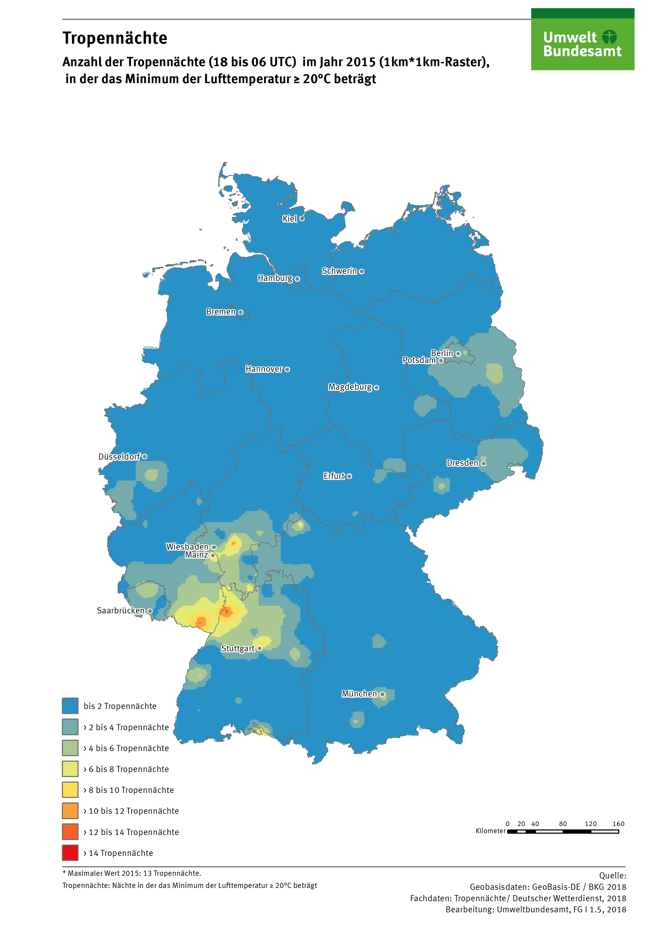 Karte: Tropennächte - Anzahl der Tropennächte (18 bis 06 UTC) im Jahr 2015
